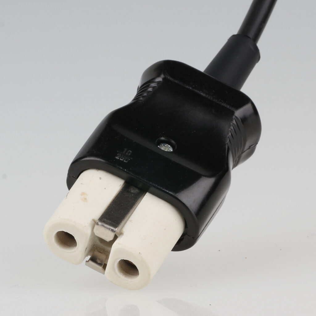 Dieser Heissgerätestecker wurde sehr oft bei alten Toastern, Bügeleisen und Waffeleisen verbaut. Da bei diesen Geräten sehr hohe Temperaturen herrschen besteht der vordere Teil des Steckers aus Keramik. Bei Montage und Installation von Stecker und Anschlussleitung muss immer ein 3-adriges Elektrokabel mit einem Leitungsquerschnitt von 3×1,0mm² mit Aderendhülsen verwendet werden.