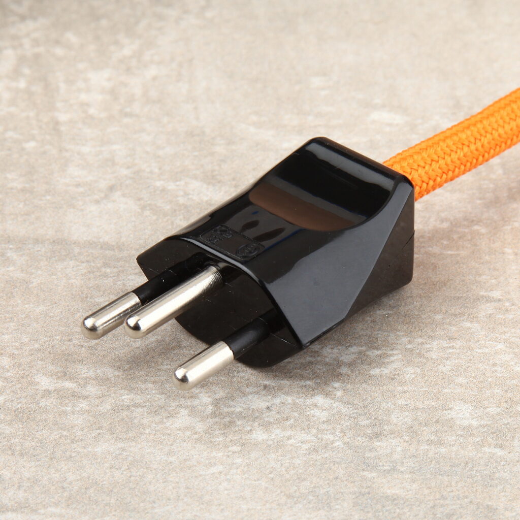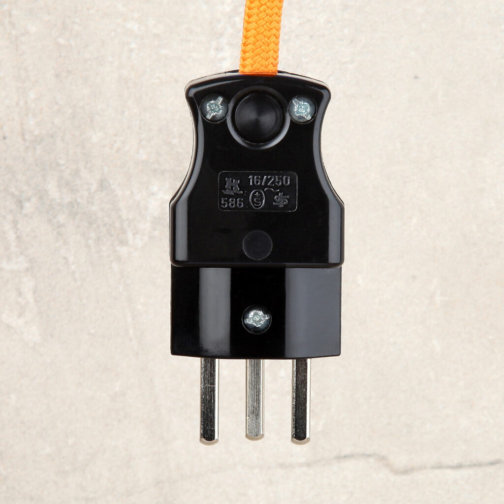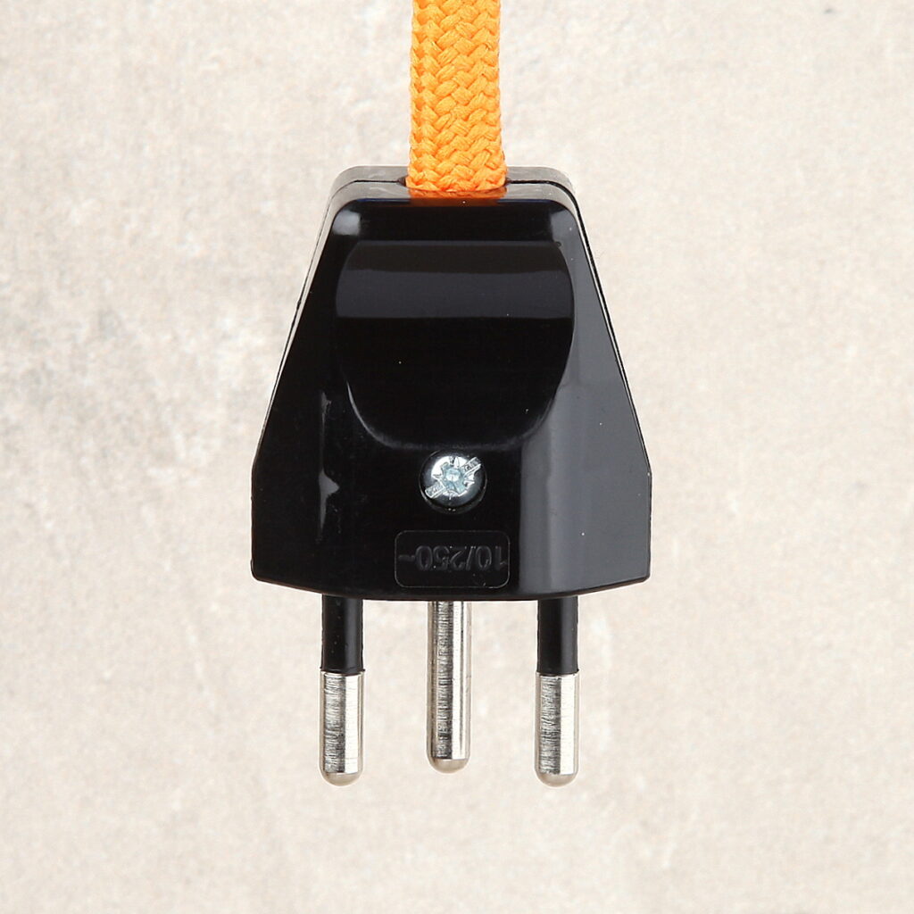 In der Schweiz werden je nach Neu oder Altbau zwei verschiedene Steckdosen Systeme verbaut. 10A/250V Stecker mit runden Stiftkontakten passen in beide Stecksysteme und Schweizer Stecker 16A/250V mit eckigen Stiftkontakten nur in die Neue Generation. Beide Steckerarten haben einen Schutzleiter Anschluss für (grün-gelb). Bei Textilkabel Montage sollte immer Isolierband verwendet werden, damit die Textilummantelung nicht aufribbelt und unschön aussieht.