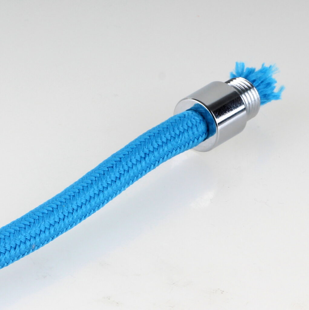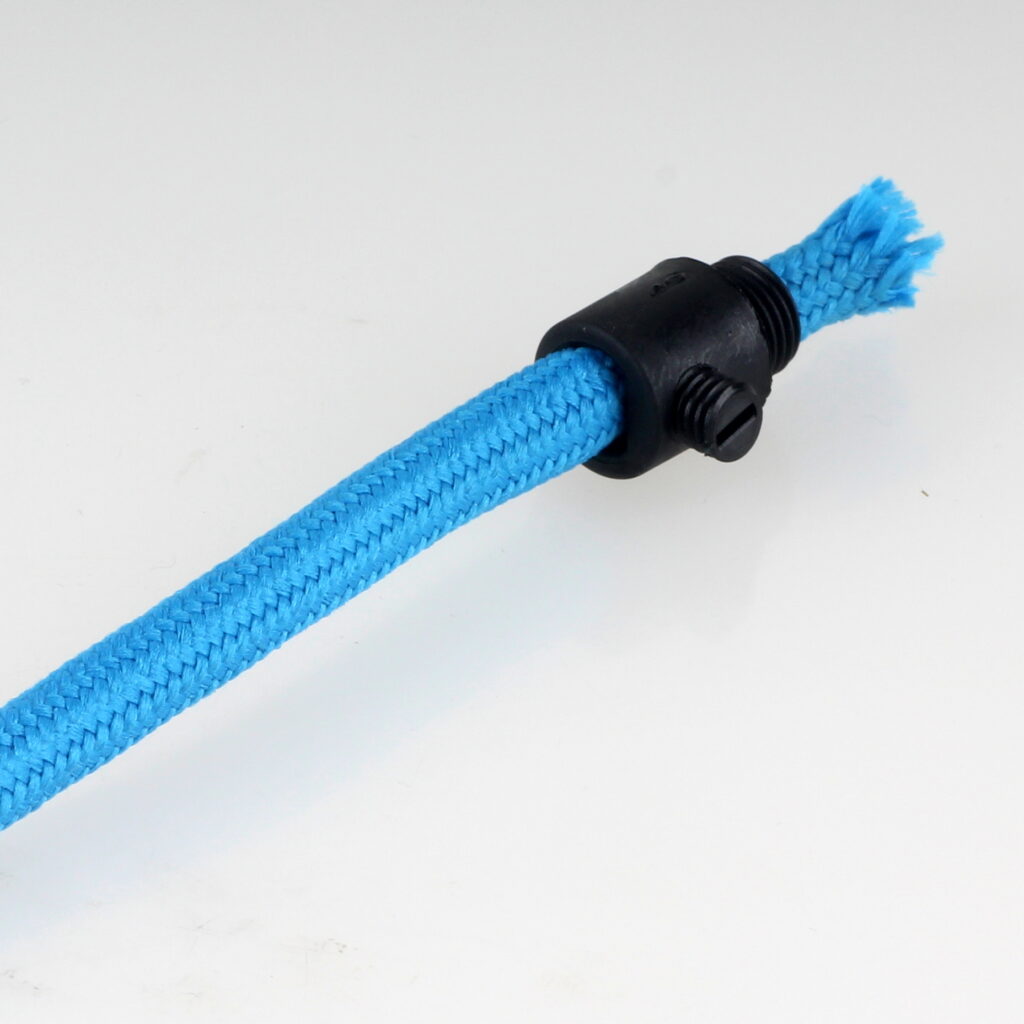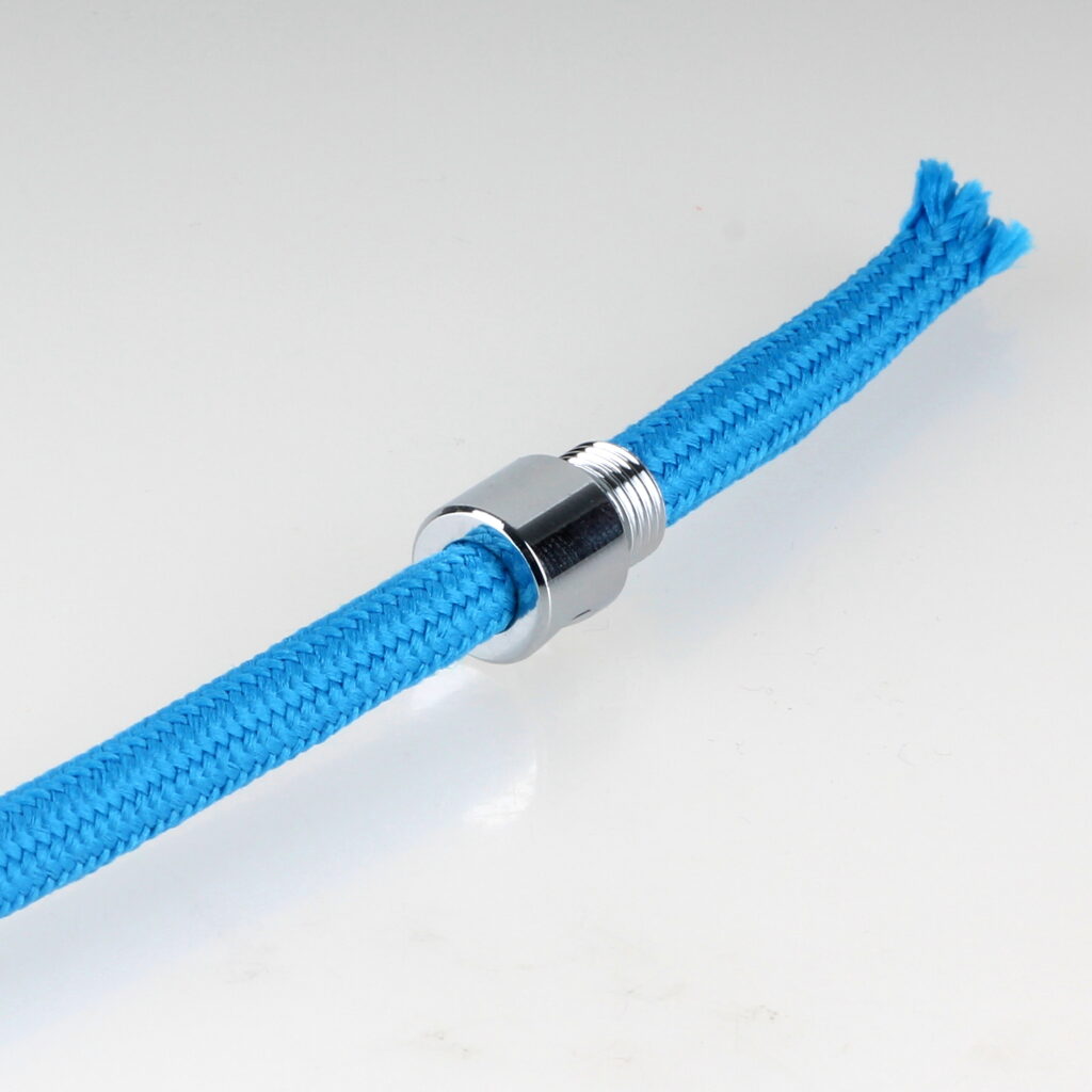 - Das vorbereitete Textilkabel lässt sich nun problemlos durch die Zugentlastung führen und anschließend für den Anschluss in der Lampenfassung weiterverarbeiten