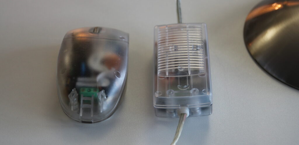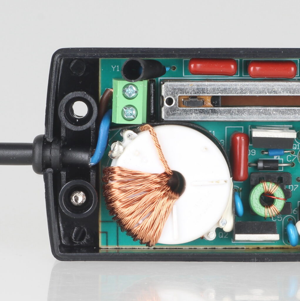 Laut Aussage unserer Kundin war die Tischlampe vollständig ohne Funktion. In der Anschlussleitung befand sich ein schnurgebundener Dimmer in Mausform, der zunächst elektrisch geprüft wurde. Das Ergebnis: Totalschaden.