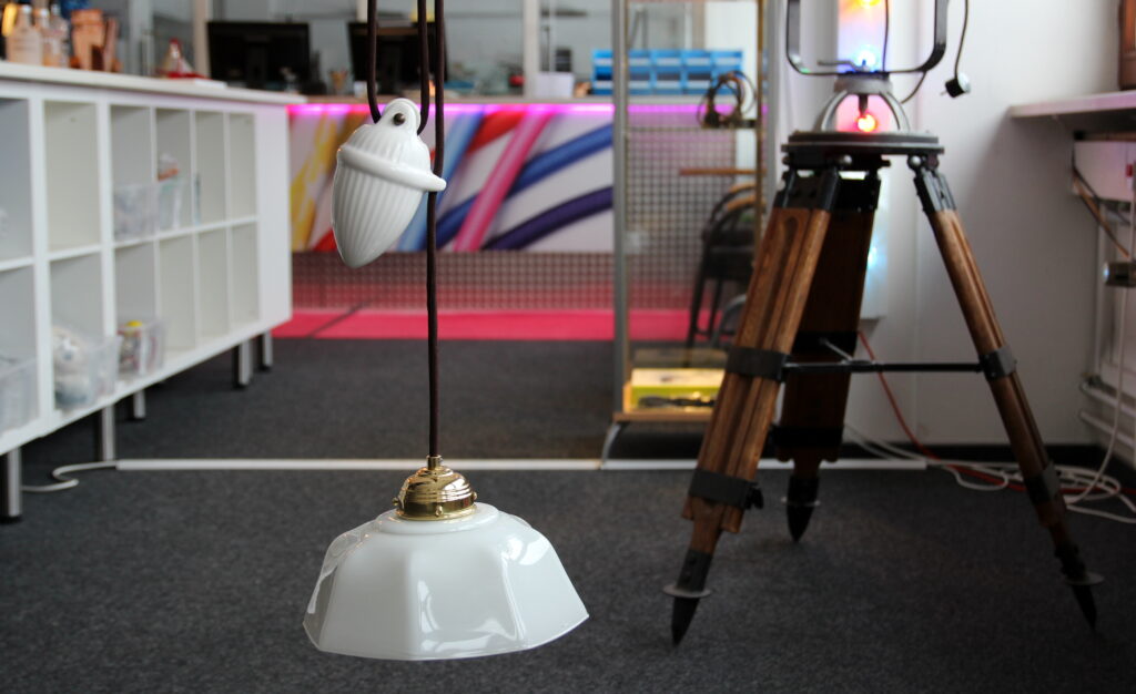 Unsere Kundin entdeckte dort eine außergewöhnlich gut erhaltene Zug-Pendel-Deckenlampe aus Porzellan – ein klassisches Modell mit höhenverstellbarer Zug-Pendelleitung und Umlenkrolle. Optisch war die Leuchte in einem bemerkenswert guten Zustand, doch vor der Inbetriebnahme sollte die Elektrik fachgerecht überprüft werden.