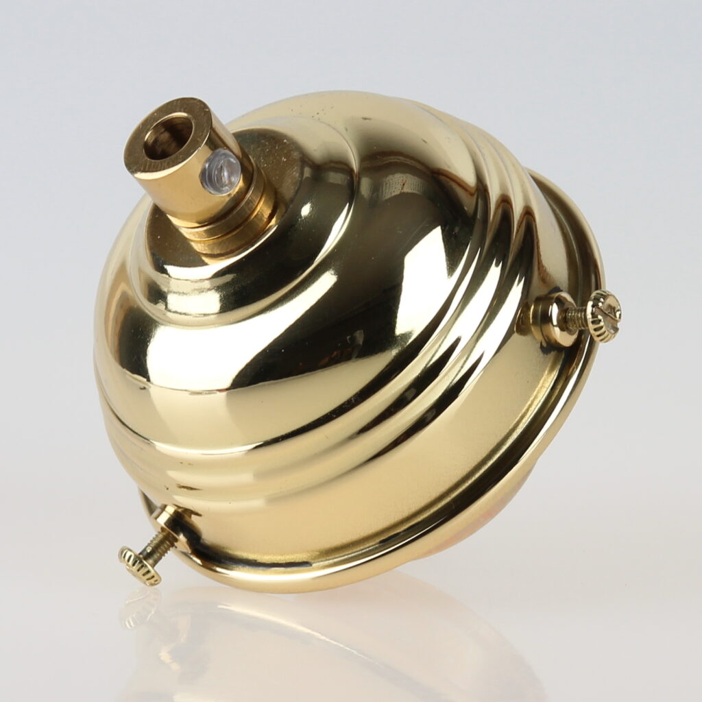 Der Glashalter fixiert das Lampenglas zuverlässig über die drei Rändelschrauben. Die polierte Messingoberfläche unterstreicht dabei die hochwertige und zeitlose Optik der Leuchte.