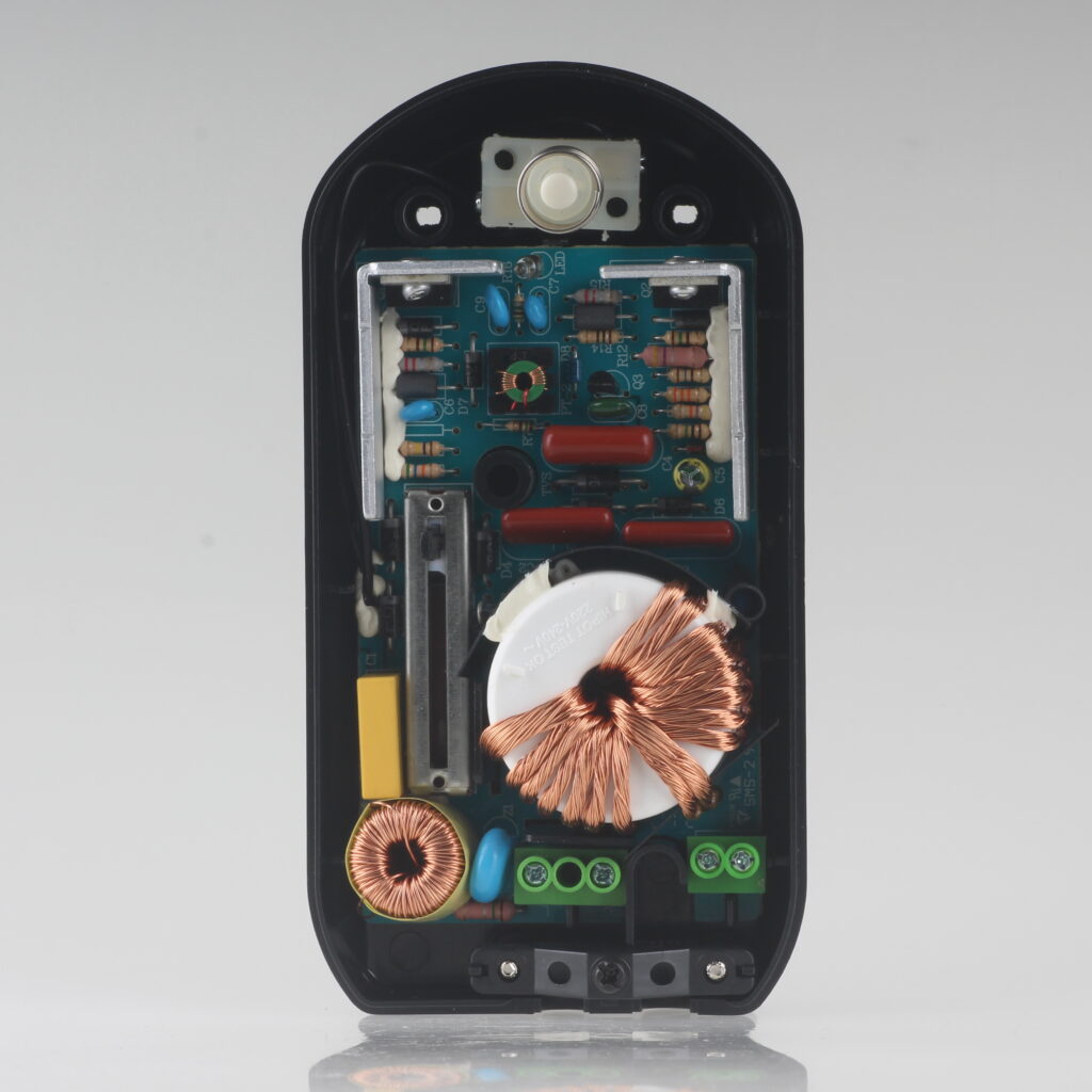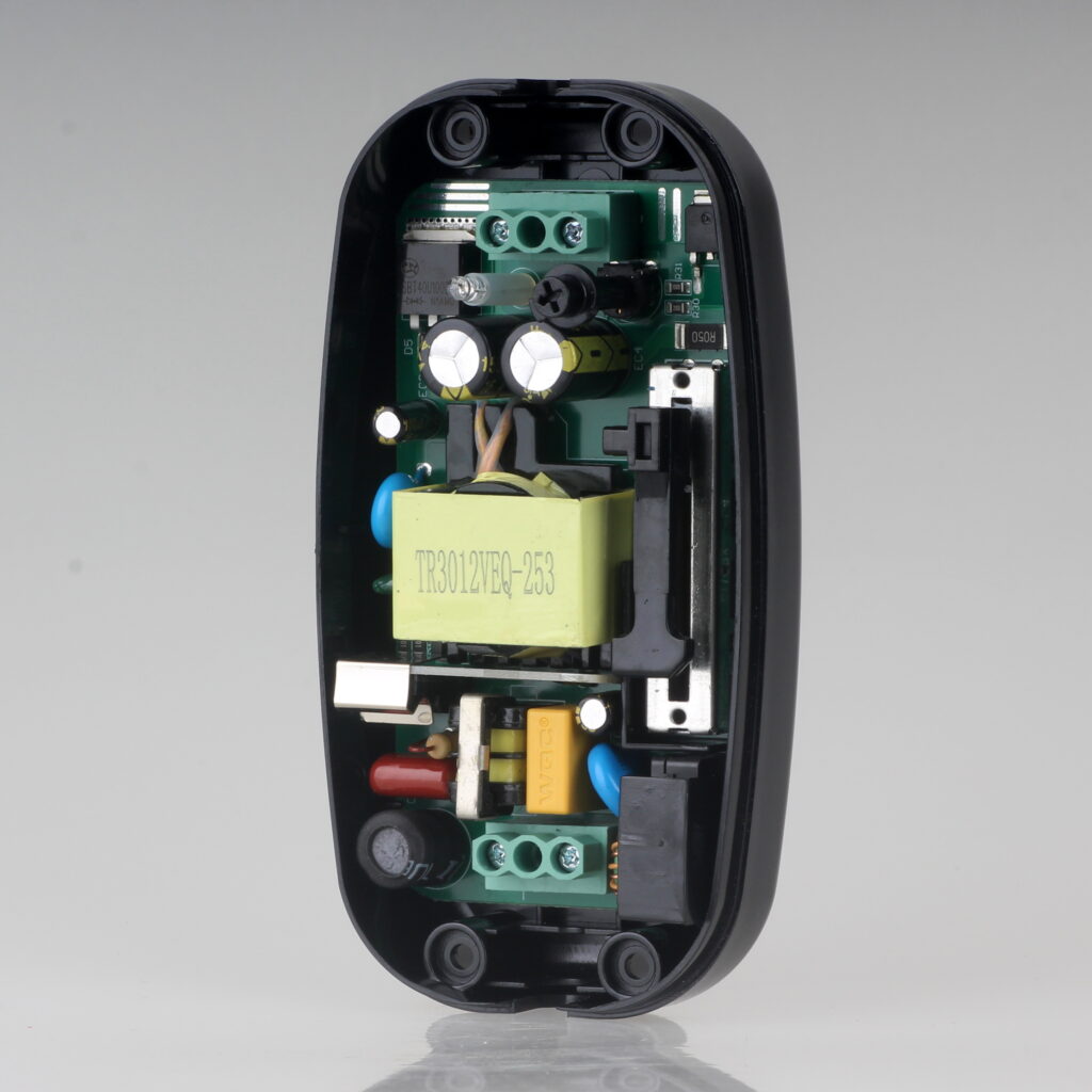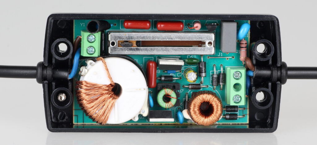 12-Volt-Dimmer enthalten einen integrierten Transformator. Dieser wandelt die Netzspannung von 230 Volt auf 12 Volt herunter.