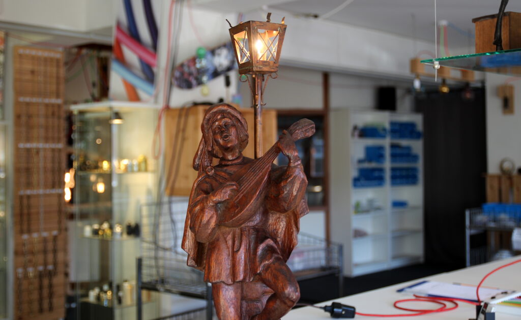 Eine über 60 Jahre alte, handgeschnitzte Figur eines Mandolinenspielers, der sich an eine kleine Laterne lehnt. Das Kunstwerk stammt aus dem Allgäu und wurde einst als Geschenk überreicht – entsprechend hoch ist der ideelle Wert für den heutigen Besitzer.