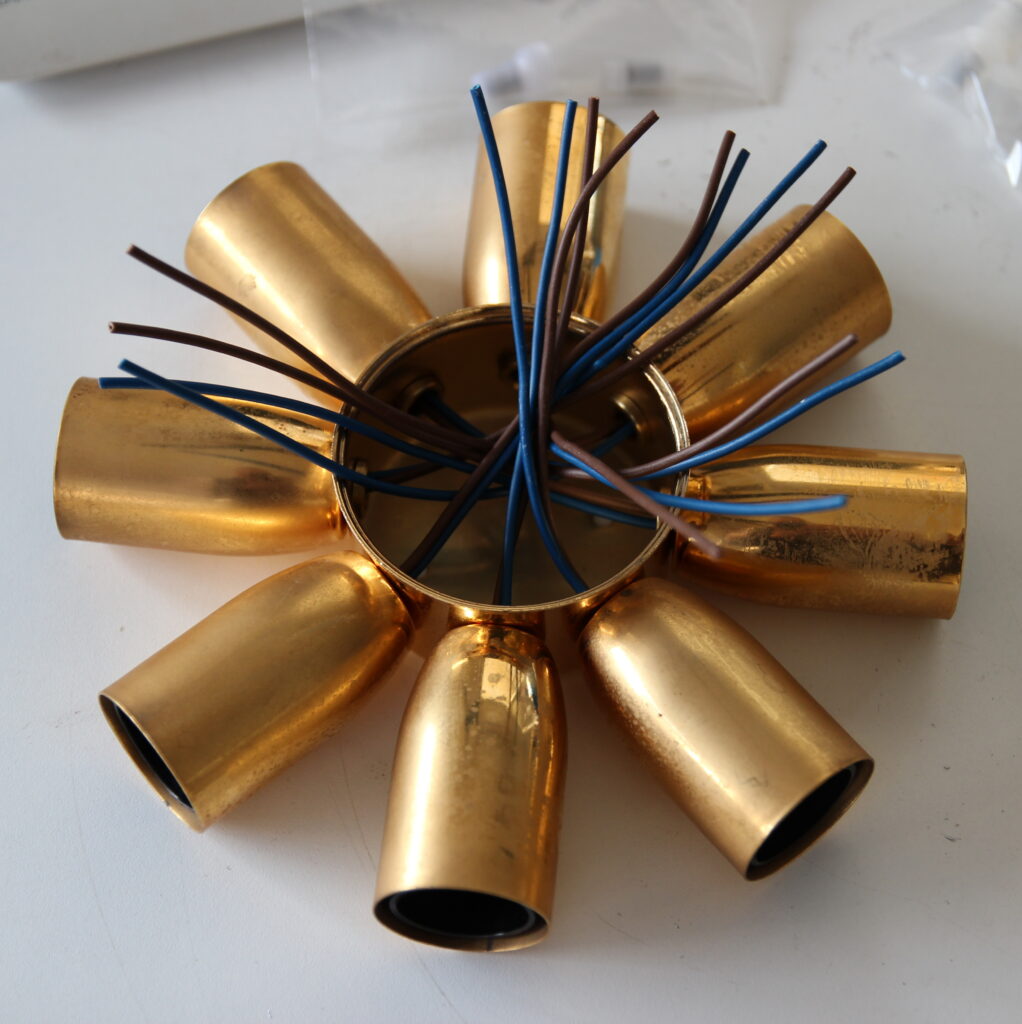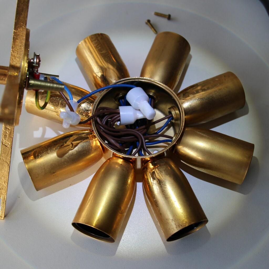 In unserem heutigen Blogbeitrag berichten wir über die Reparatur eines messingfarbenen Decken-Kronleuchters mit Kristallbehang, den uns ein Kunde zur Überprüfung der Elektrik übergeben hat. Es handelt sich um einen klassischen 8-flammigen Ring-Kronleuchter mit E14 Lampenfassungen, bei dem die Fassungen kreisförmig angeordnet sind und mit messingfarbenen Fassungshülsen verziert sind.