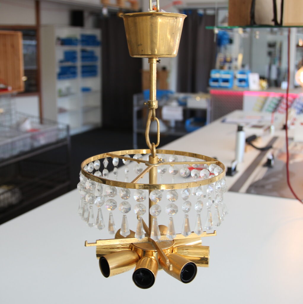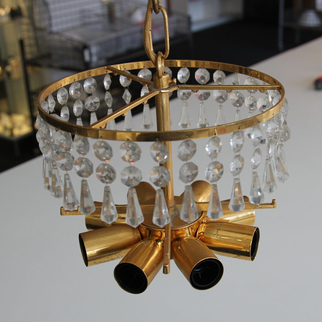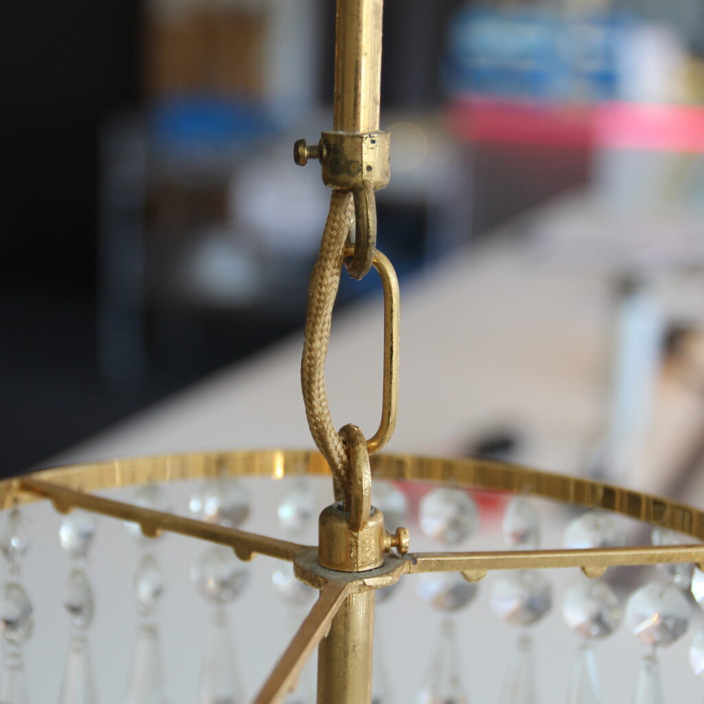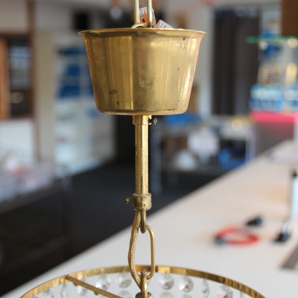 Der Leuchter besitzt einen Messing- bzw. goldfarbenen Rahmen mit Kristallbehang. Der ursprüngliche Kristallschmuck wurde vom Kunden vor der Reparatur teilweise abgenommen, damit wir die elektrische Überprüfung besser durchführen konnten.