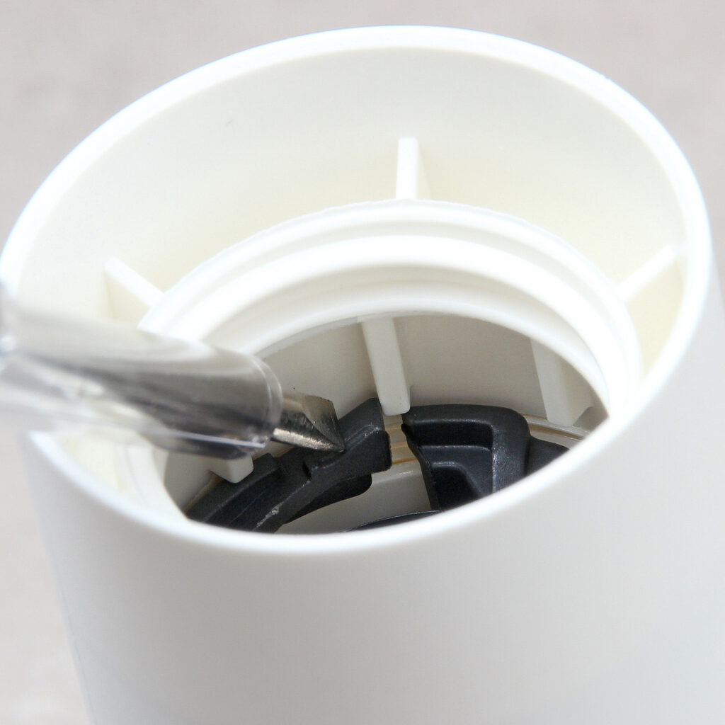 Zum Öffnen muss diese Sicherung vorsichtig gedrückt werden, danach lässt sich der Mantel abschrauben.
