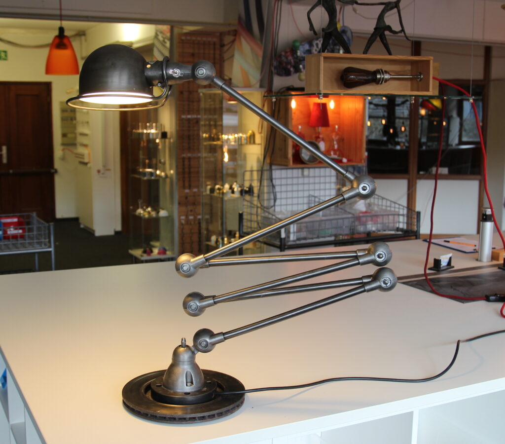 Die Jielde Lampe besitzt mehrere bewegliche Gelenkarme, durch die das Kabel geführt wird.