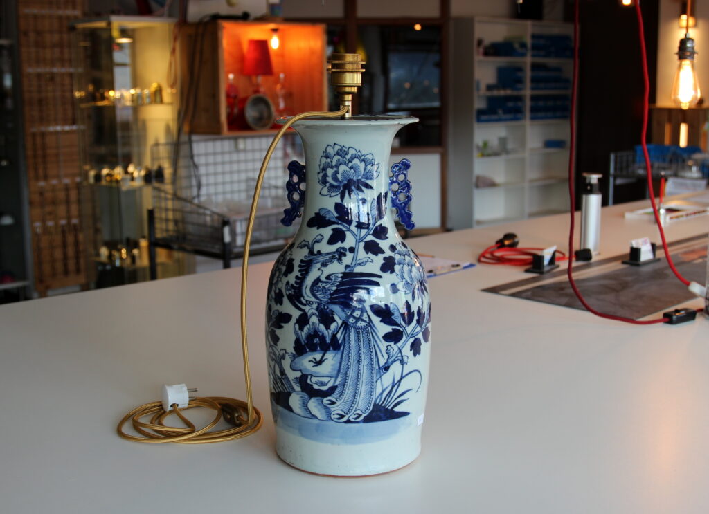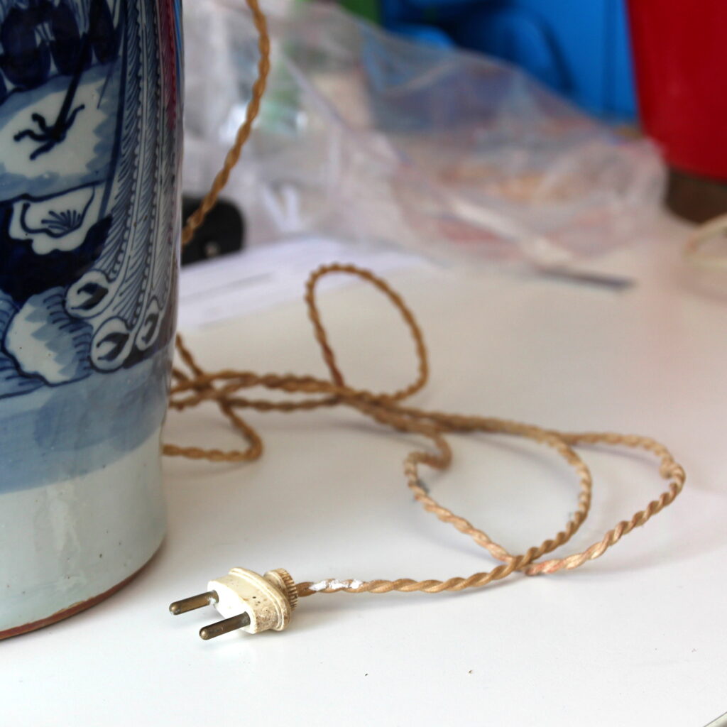 Bei der Leuchte handelt es sich um eine ehemals dekorative Vase, die vor vielen Jahren zu einer Tischlampe umgebaut wurde. Unsere Kundin beauftragte uns, die vorhandene Elektrik vollständig zu überprüfen und zu erneuern.